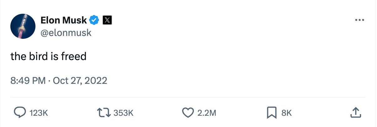 This was posted right as he completed the $44B Twitter acquisition. This phrase refers to Twitter’s bird logo and Musk’s stated desire for fewer content limits.
