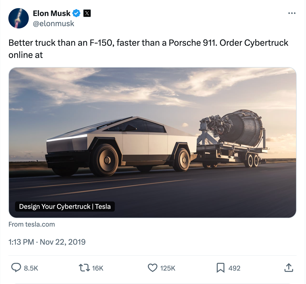 In the days after, Musk kept posting content to re-steer the narrative toward performance and capability (including comparisons to the F-150).