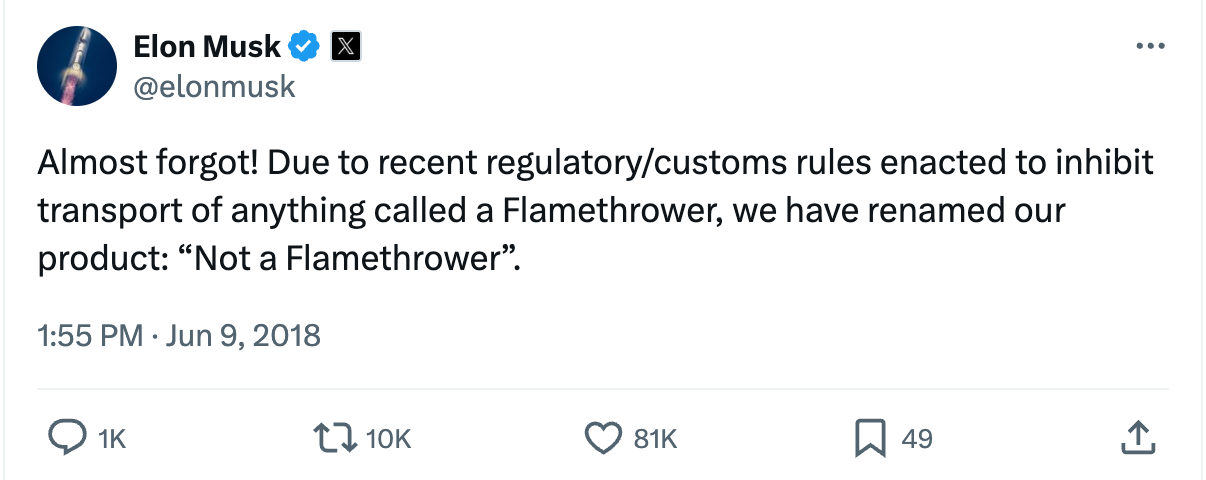 (“Due to regulatory/customs… we have renamed our product: ‘Not a Flamethrower’.”) X (formerly Twitter)