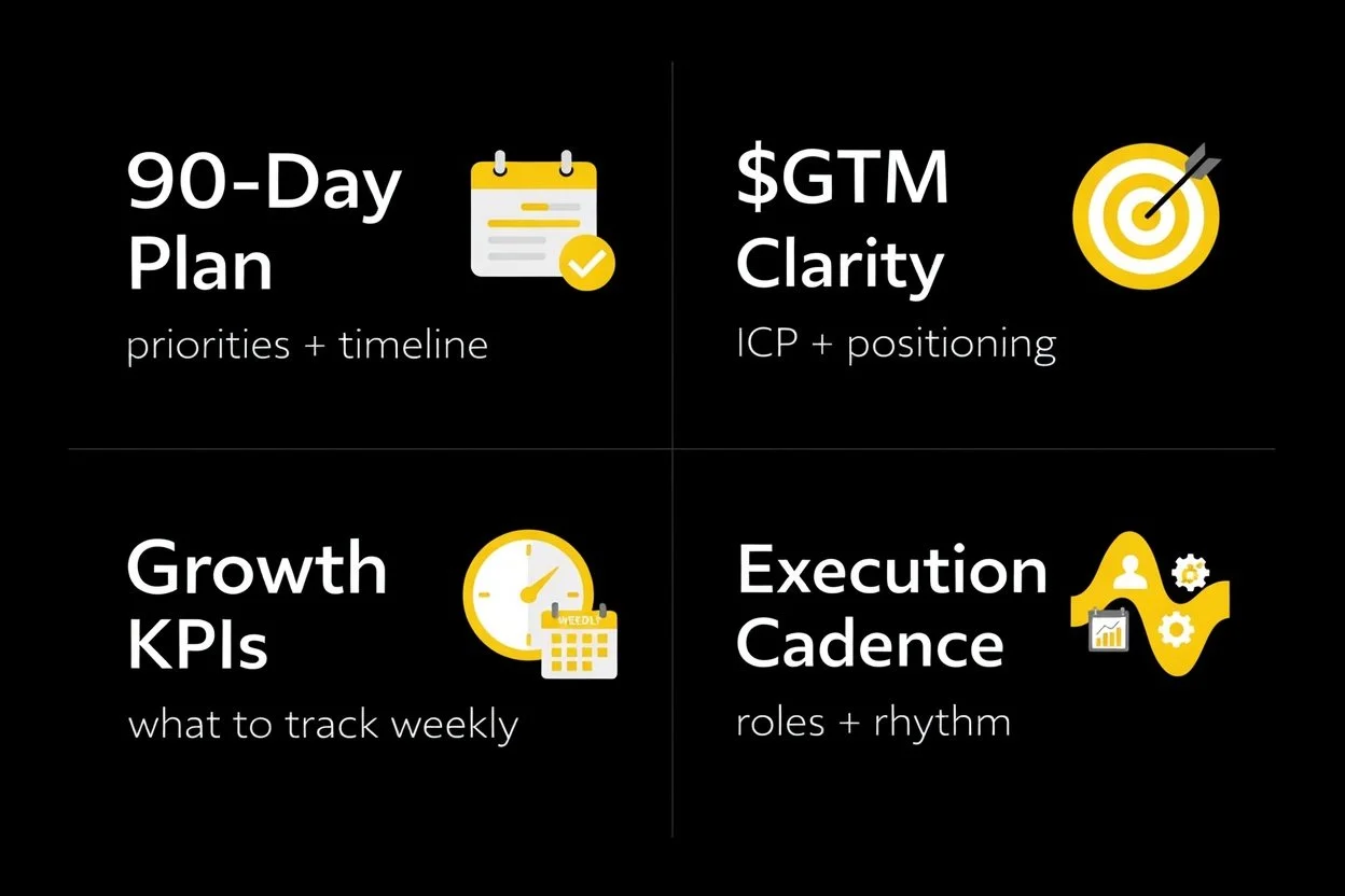 We combine leadership + systems. That usually means clarifying your growth strategy, tightening your go-to-market, defining the KPI model, and building repeatable operating rhythms so your team can execute with speed and confidence. The goal is to reduce friction, improve decision-making, and make growth more predictable.